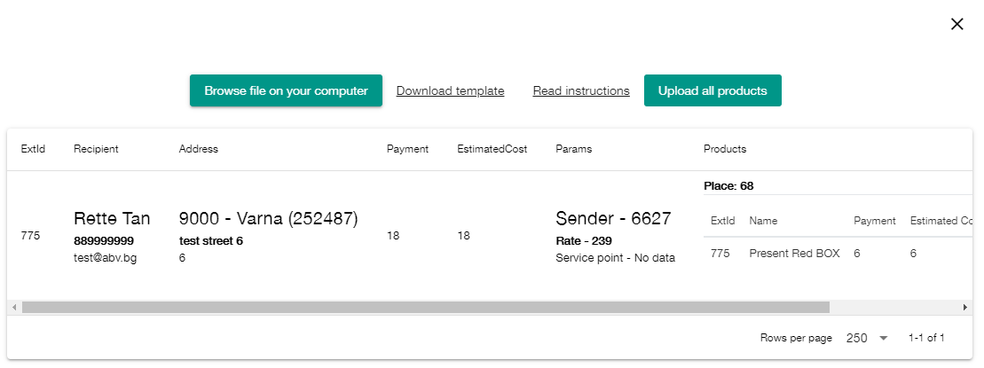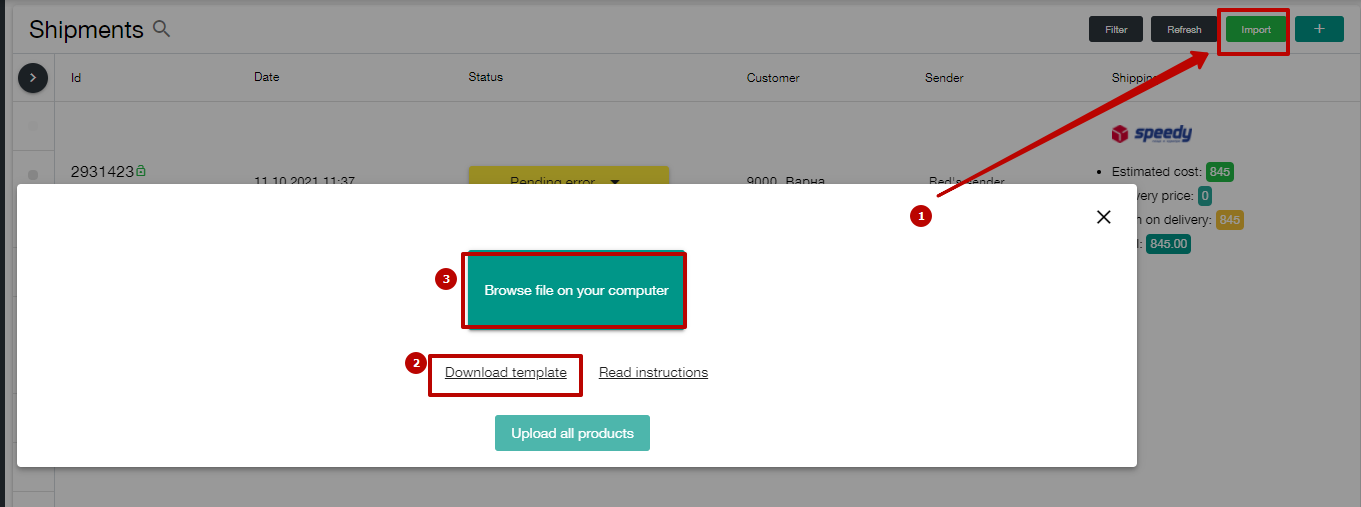 2. Press ''Download template'' to download a table for shipment info, save it and then press ''Browse file on your computer '' to import the table. ->