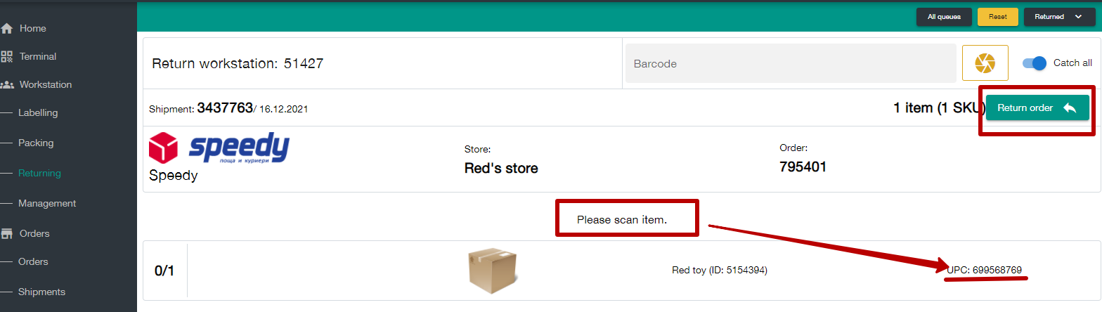 5. Order has been scanned, no the system is asking to scan the items from the order or can just press the button or the top right to return the order