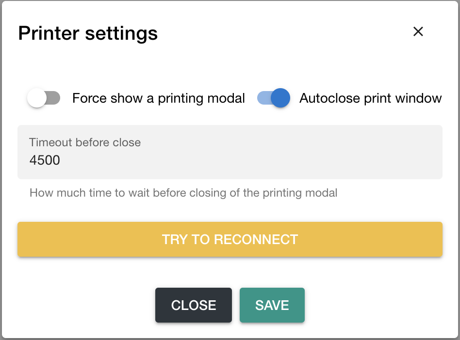This button indicates printer status. Tap on this button and you will get the modal window with the printer settings. Try to connect your printer with the "Try to reconnect" button.