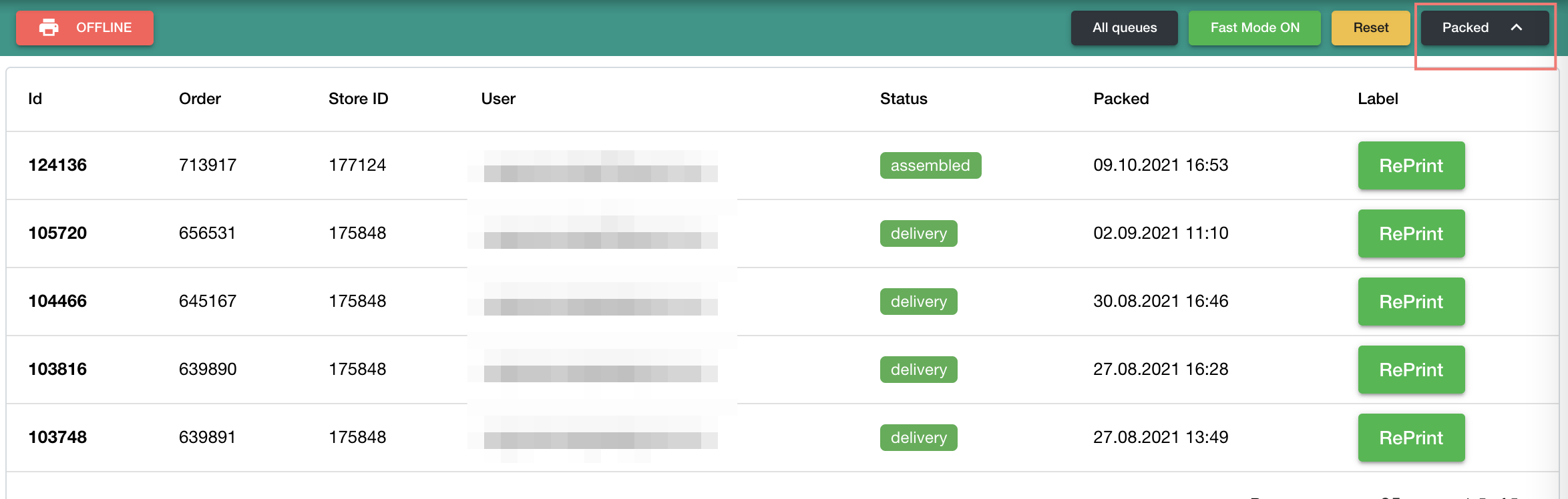 Pic.6. Packing queue created in advance in Menu->Workstations-> Packing by Order ID.