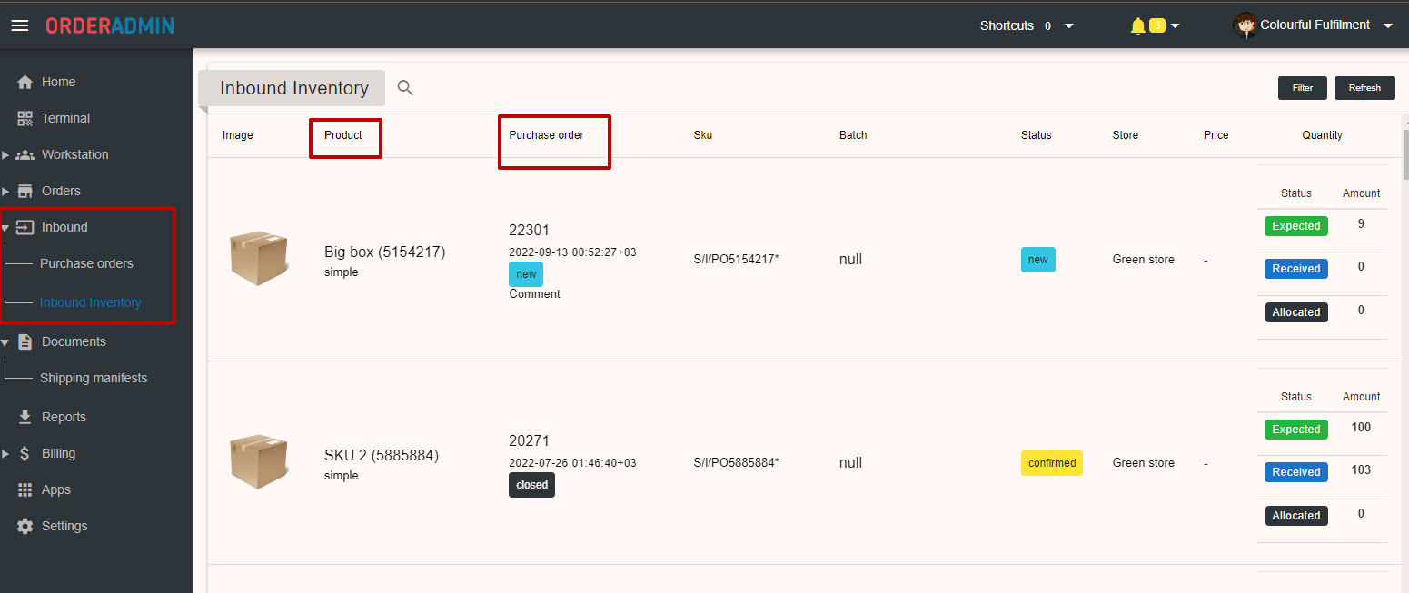 Inbound inventory is where you can see all the accepted items with their Purchase order (PO) that have been accepted to the warehouse.