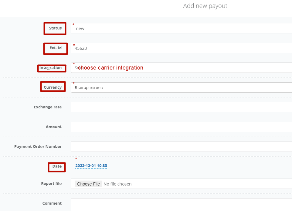- 2. Now complete the fields. The required fields are status, ext.id, Integration, currency, and date. The other fields will be filled automatically.